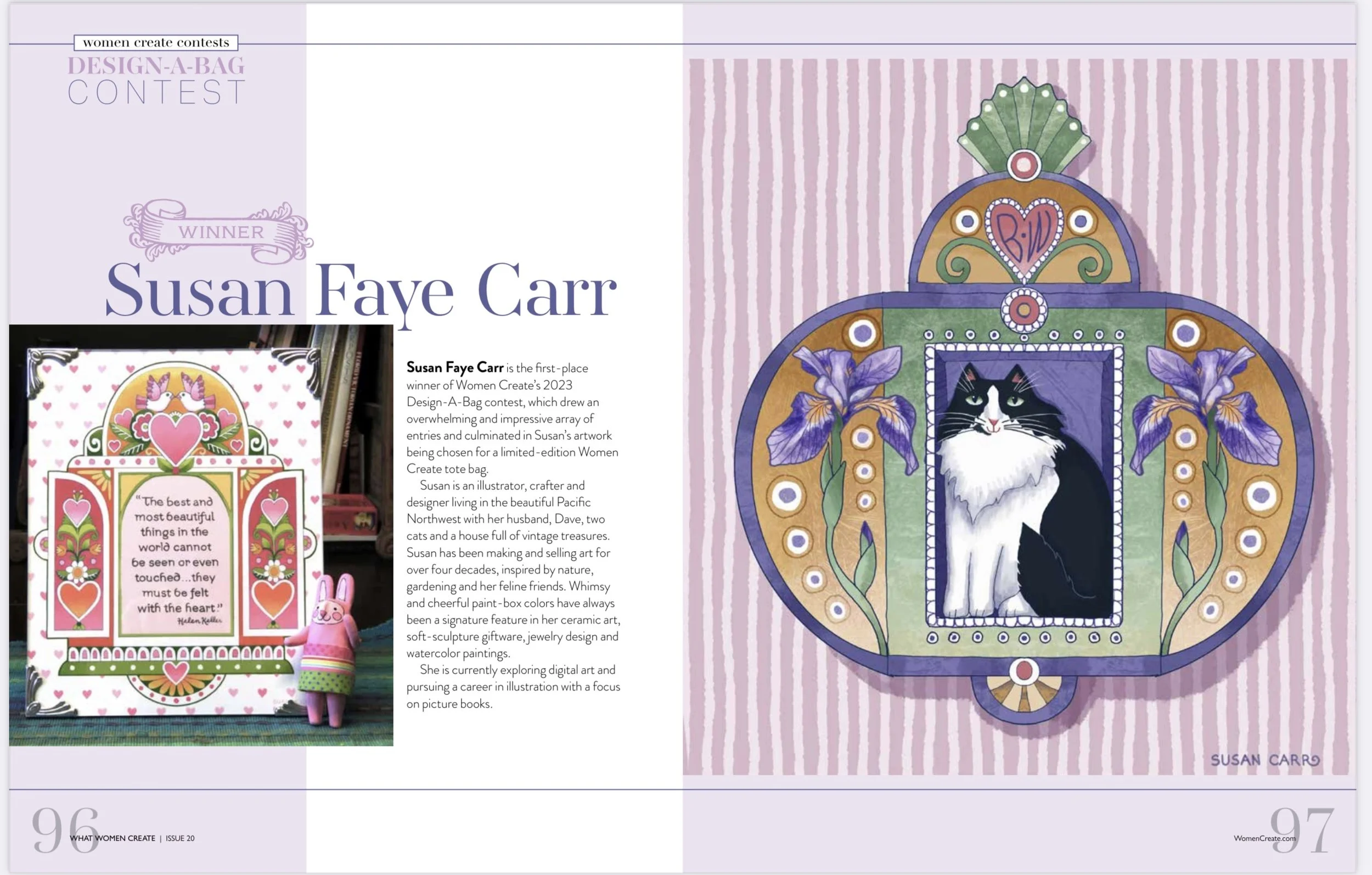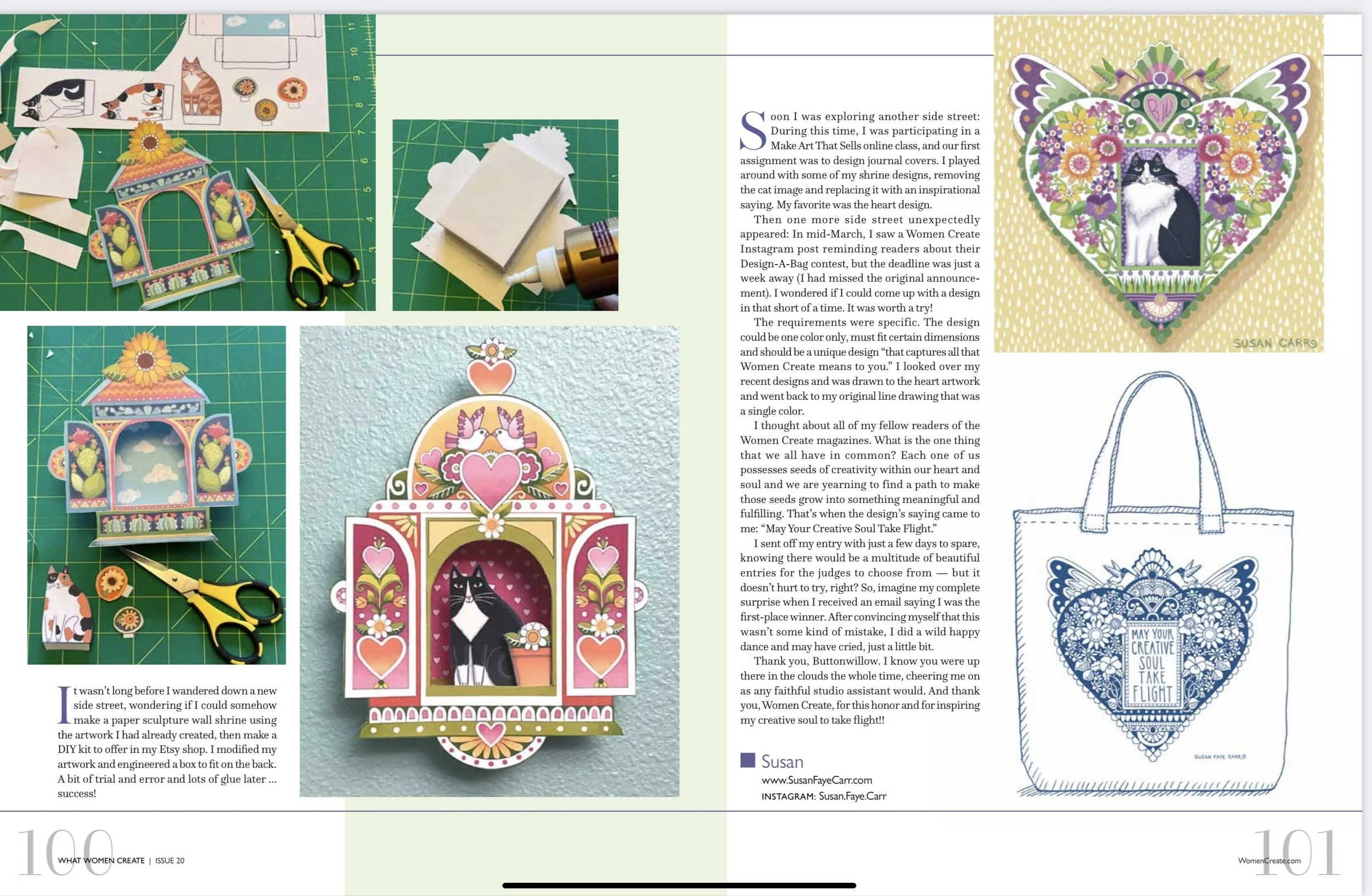 I was delighted to be featured in the Fall 2023 issue of WHAT WOMEN CREATE magazine after winning first place in their Design-A-Bag Contest. My artwork appears on their promotional tote bag. The article describes my journey designing pet shrines, which eventually led to the winning design!